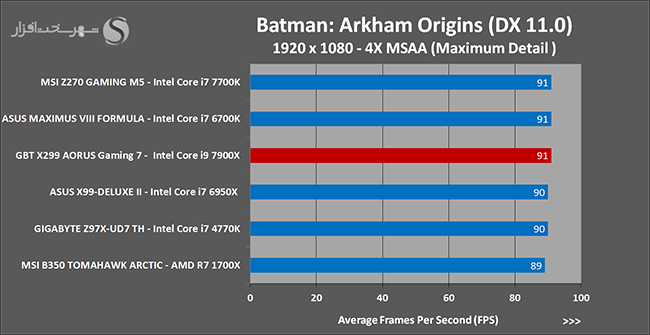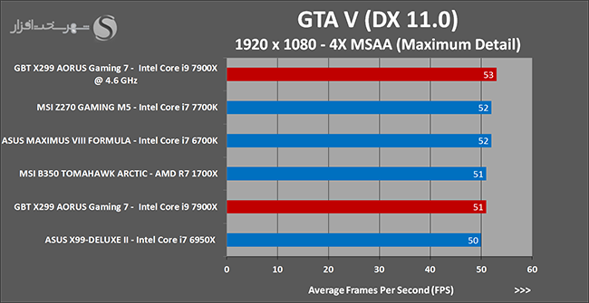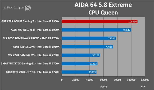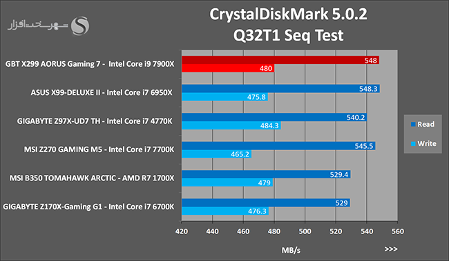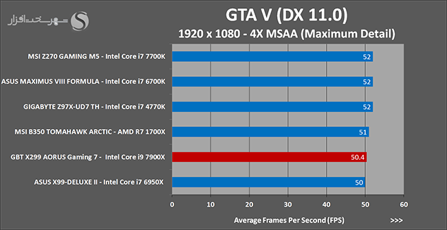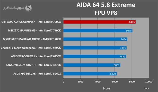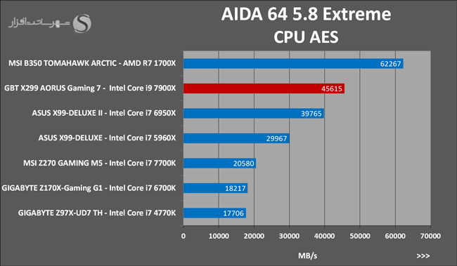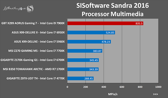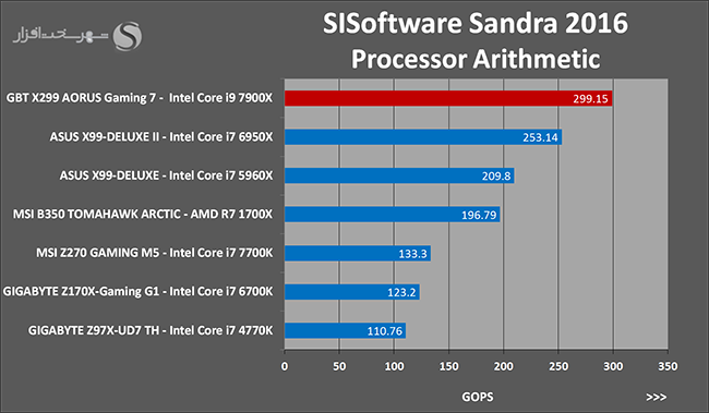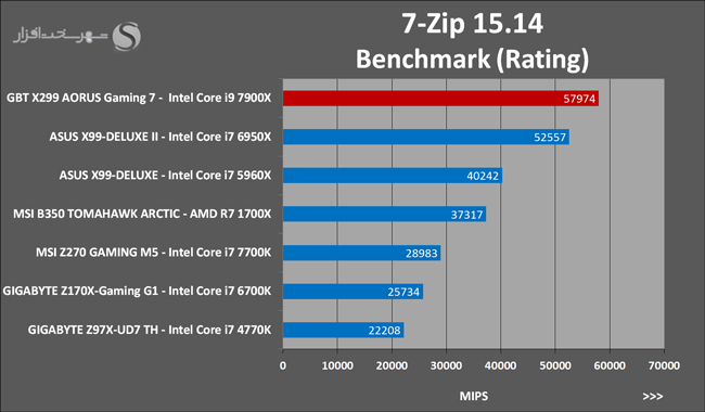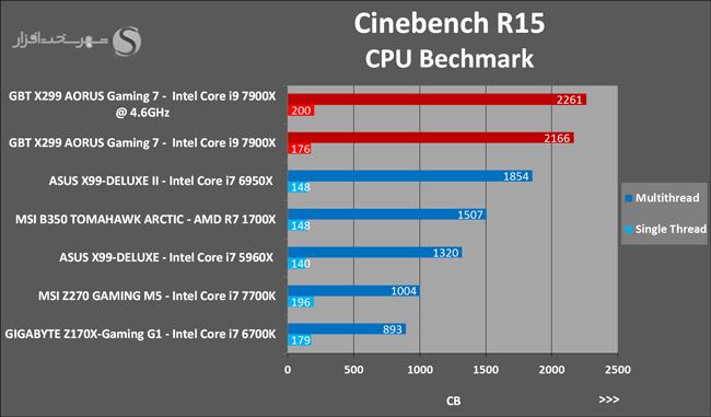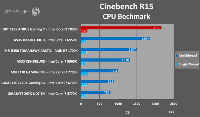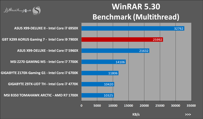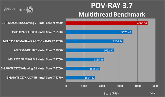 علیرغم Multithread نبودن این تست اما عملکرد پردازنده Intel Core i9 7900X در مقایسه با مدل مشابه نسل قبل یعنی Intel Core i7 6950X به مراتب بهتر است! علت این امر فرکانس بالاتر Turbo Boost (4.5GHz) و البته Instructions Per Cycle (IPC) نسبتاً بهتر پردازنده نسل جدید است.