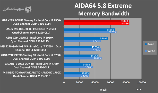 تست پهنای باند حافظه از جمله تستهایی هست که نتایج آن کاملاً به وضعیت سیستمعامل، فرکانس و معماری ساخت پردازنده و کنترلر حافظه، Bios هوشمند در انتخاب بهترین و عین حال پایدارترین تایمینگ های اصلی و Advanced و پیکربندی و فرکانس ماژولهای حافظه و State های مختلف مدیریت مصرف انرژی وابسته است.همانطور که ملاحظه میکنید پهنای باند حافظه در این پلتفرم به معنای واقعی کلمه خارقالعاده و بینظیر است. این در حالی است که در این تست از ماژولهای حافظه Quad Channel با فرکانس DDR4 3200MHz استفاده شده و البته Bios این مادربرد نیز هنوز به بلوغ کامل نرسیده است! مطمئناً باوجود پشتیبانی این مادربرد از ماژولهای حافظه DDR4 با فرکانسهای بیش از 4000MHz و همچنین بهروزرسانی Bios به نسخههای جدیدتر با نتایجی شگفت انگیز روبرو خواهید بود!