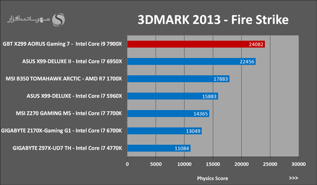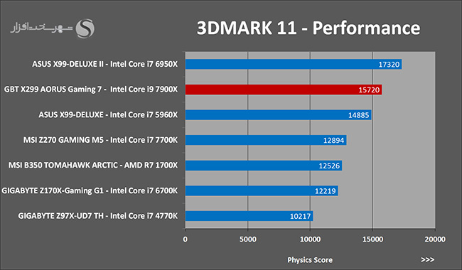 میزان حافظه Cache کمتر پردازنده Intel Core i9 7900X در مقایسه با Core i7 6950X و همچنین سازگار نبودن نرم افزارهای قدیمیتر با الگوریتمهای مدرن و کاملاً Multi Thread پردازش از جمله مهمترین دلایلی است که مانع از بروز تمامی قدرت Intel Core i9 7900X در برخی از تستها میشود. در نتایج ثبت شده تست 3DMARK 11 این بخش نیز شاهد همین اتفاق هستیم.