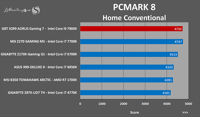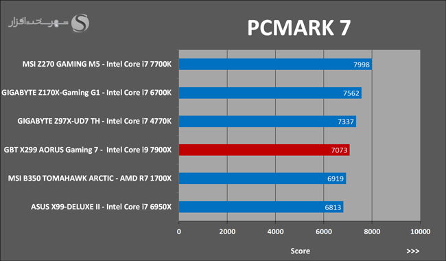 در این سری نرمافزارهای Benchmark کارایی کلی سیستم بر اساس تستهای کاملاً Multithread مانند نمایش و ویرایش عکسهای دیجیتال، پخش و ویرایش انواع مختلف موزیک و ویدئو، پخش تصاویر 3 بعدی مانند انواع گیم، جابهجایی اطلاعات بین device های مختلف، شبیه یازی نرمافزاری امنیتی، رمزگشایی صفحات وب و ... . محک زده میشود.در این بخش نیز نتایج مشابه تست 3DMARK به دست آمده است. الگوریتمهای مدرنتر و Multi Thread پردازش اطلاعات در نسخه جدیدتر نرم افزار PCMARK مجال عرض اندام را برای Intel Core i9 7900X فراهم کرده است.
