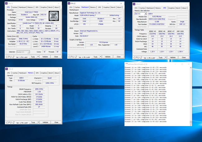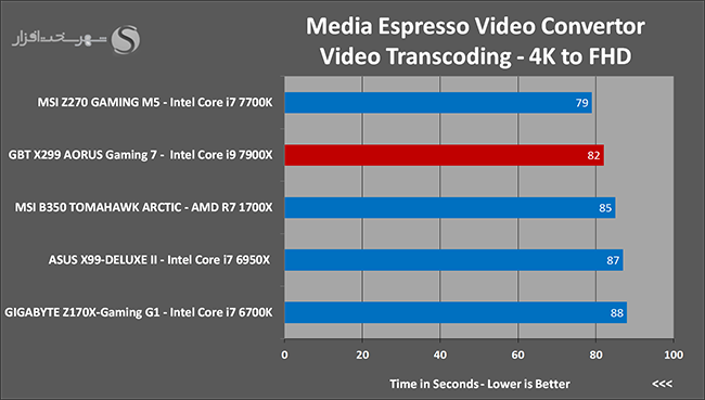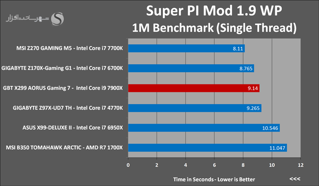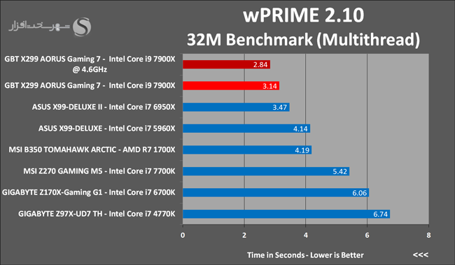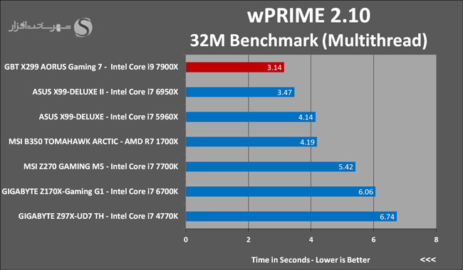 wPrime از جمله نرمافزارهایی میباشد که با محاسبه الگوريتمي تکرار شونده (تخمين تابع به روش نيوتن) بهصورت کاملاً Multithread، يکي از بهترين نرمافزارهای موجود براي تست کارایی پردازنده و مادربرد محسوب میشود. Super PI نیز یک نرم افزار Single Thread برای محاسبه عدد π با استفاده از الگوریتم Gauss–Legendre تا 232 رقم اعشار است. فرکانس و معماری هسته پردازنده تعیین کننده ترین عوامل در افزایش سرعت پردازش این نرم افزار هستند.در این دو تست نیز دو روی متفاوت سکه را میبینیم. عملکرد بسیار خوب Intel Core i9 7900X در تست کاملاً Multithread تست wPRIME و البته جا ماندن آن از پردازندههای 4 هستهای با فرکانس بالاتر در تست Single Thread نرم افزار Super PI. البته همانطور که اشاره شد به دلیل فرکانس بالاتر Turbo Boost (4.5GHz) و البته Instructions Per Cycle (IPC) نتایج ثبت شده در این بخش نیز به مراتب بهتر از پردازنده مشابه نسل قبلی این پلتفرم است.