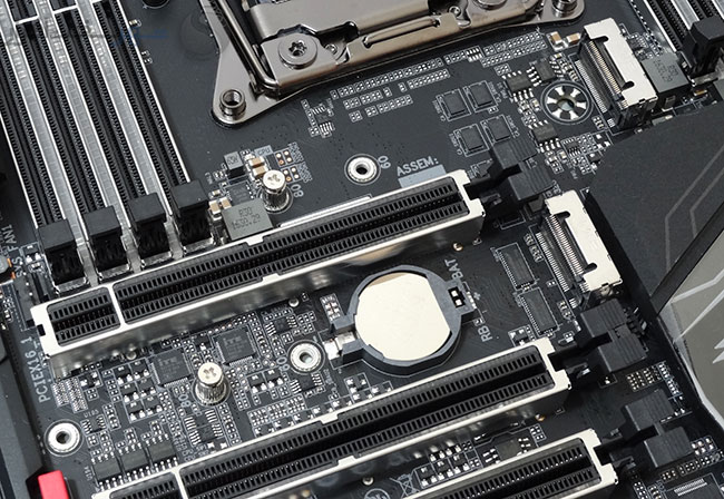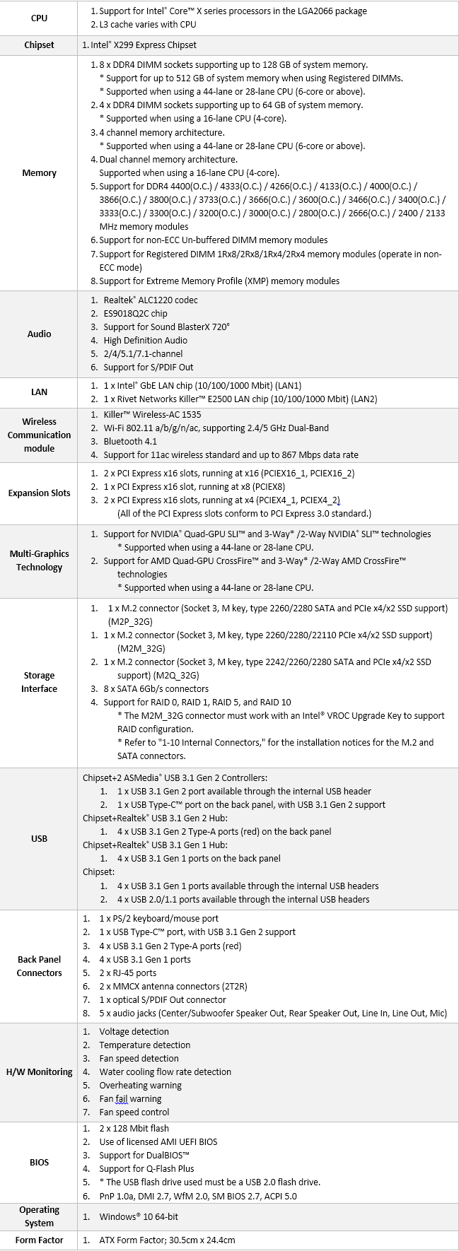 همچنین منابع PCIe تخصیص یافته به اسلات دوم X4 این مجموعه که از چیپست Intel X299 منشعب شده است با درگاه M.2 X4 تعبیه شده در بین اسلات اول و دوم به صورت اشتراکی در نظر گرفته شده است و فعال شدن هر یک از این دو درگاه، درگاه دوم غیرفعال میشود.