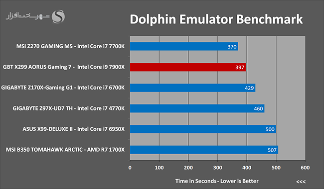 Dolphin Emulator یک شبیه ساز بسیار قدرتمند برای اجرای بازیهای کنسولهای GameCube و Wii در PC آن هم با رزولوشن 1080p میباشد. کارایی بسیار بالا به همراه پشتیبانی از بازیهای آنلاین و تحت شبکه از ویژگیهای ممتاز این شبیه ساز محسوب میشود.عملکرد Benchmark این شبیه ساز به این صورت است که در این بخش الگوریتمی استاندارد و ثابت که شامل رندر یک صحنه پیچیده 3 بعدی با استفاده از تکنیک ray tracing میشود اجرا و زمان سپری شده برای رندر کامل این صحنه ملاک کارایی پردازنده محسوب میشود. البته مد نظر داشته باشید که این نرم افزار کاملاً Multithread نیست و فرکانس و معماری هسته پردازنده مهمترین نقش را در اجرای سریعتر این شبیه ساز بازی میکنند.