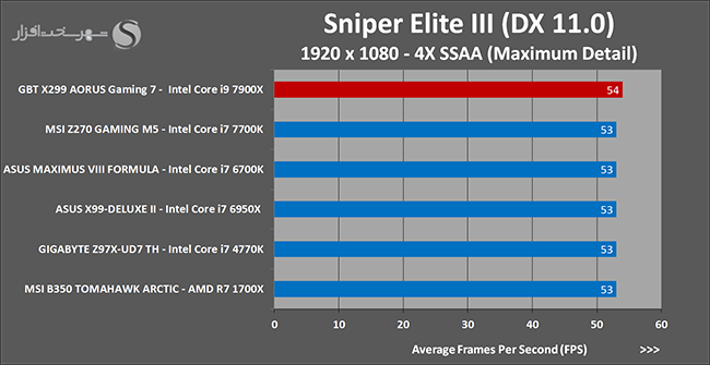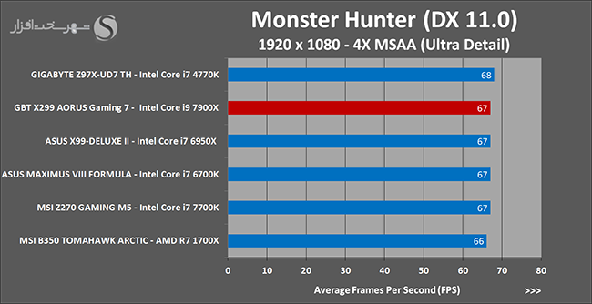Monster Hunter که یک بازی تحت شبکه پرطرفدار است محصول کمپانی Tencent Games بوده و موتور گرافیکی بسیار قدرتمند Crytek به همراه قابلیتهای واقعگرایانه جدید GameWorks کمپانی Nvidia مثل NVIDIA PhysX Clothing, NVIDIA Hairworks و NVIDIA HBAO+ را با خود همراه دارد. ویژگیهای نامبرده بهعلاوه تکنولوژیهای مدرن Real Time Rendering, Physical Based Shading, Realistic Vegetation Rendering همگی باعث شدهاند تا Benchmark این بازی در حال حاضر یکی از مدرنترین و در عین حال زیباترین دموهای گرافیکی مبتنی بر DirectX 11 محسوب شود.نتایج ثبت شده در تستهای گیمینگ نیز بیانگر این مطلب است که Intel Core i9 7900X پردازنده بدی برای گیمینگ نیست و به دلیل فرکانس بالاتر Turbo Boost و IPC نسبتاً خوب بر خلاف اجداد قبلی خود کارایی بسیار خوبی در این بخش دارد؛ اما اگر این پلتفرم را صرفاً جهت گیمینگ تهیه میکنید بدون شک این مدل گران قیمت 10 هستهای بهترین و البته مقرون بهصرفهترین پردازنده این خانواده محسوب نمیشود و انتخابهای به مراتب بهتری در این خانواده وجود دارد.