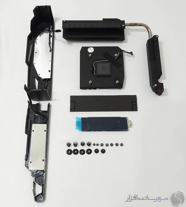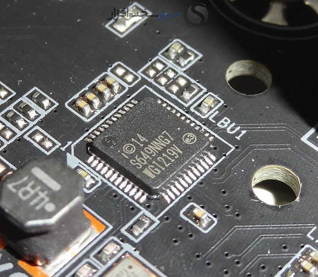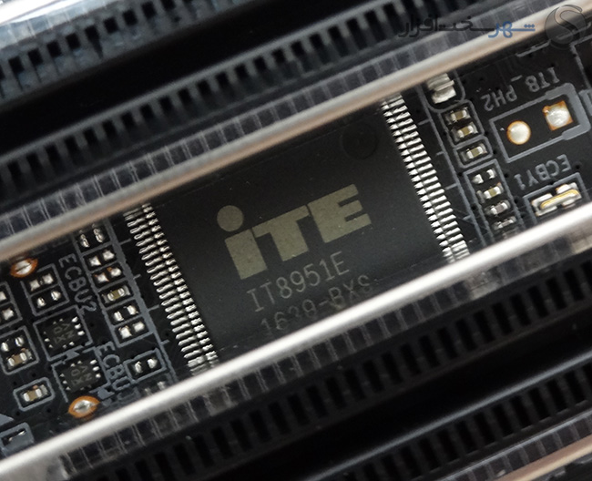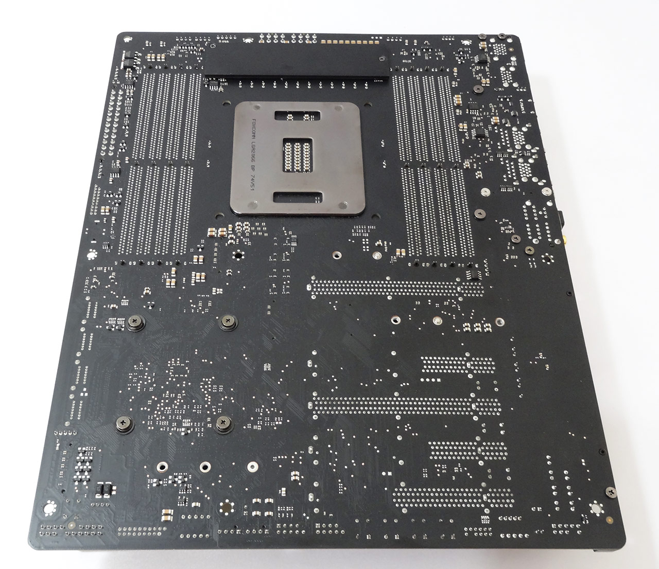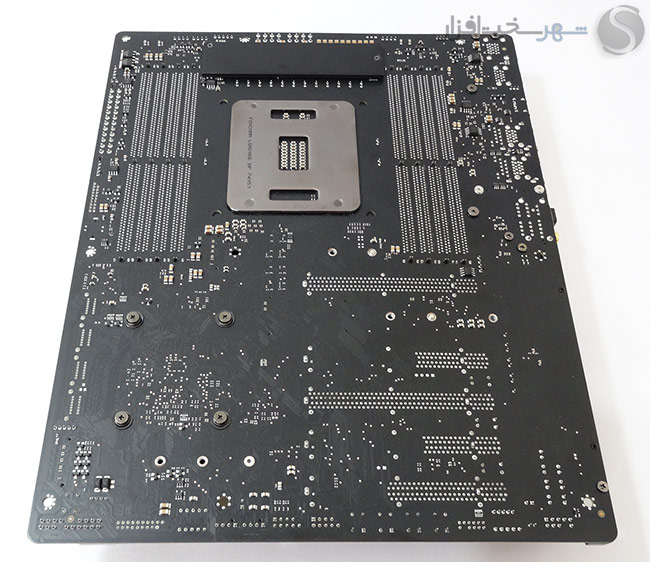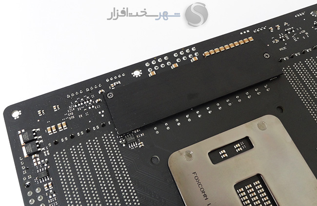 بهواسطه فرآیند تولید تمام خودکار، دیگر مادربردی را میتوان پیدا کرد که کیفیت ساخت و لحیم کاری بیکیفیتی داشته باشد. این مادربرد نیز از این قاعده مستثنی نیست. همانطور که در تصویر بالا ملاحظه میکنید هیتسینک ها و محافظهای پلاستیکی تعبیه شده بر روی PCB بهواسطه 17 پیچ فنر دار و معمولی بر روی این برد نصب میشوند. همچنین به دلیل تثبیت هر چه بیشتر هیتسینک مدار رگولاتور ولتاژ پردازنده و جذب حرارت منتقل شده به پشت PCB توسط این بخش، یک تسمه فلزی دقیقاً در پشت مدار VRM تعبیه شده است.