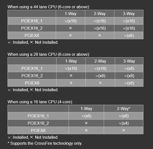 این مادربرد به 5 اسلات PCIe X16 3.0 مجهز شده است که در این بین از بالا اسلات های اول، سوم و پنجم به صورت مستقیم و بدون واسطه از شریانهای منشعب شده از کنترلر PCIe تعبیه شده در پردازنده تغذیه میشوند. اسلات های دوم و چهارم این مجموعه نیز از چیپست Intel X299 منشعب شدهاند و به صورت عملیاتی با سرعت X4 کار میکنند. این مادربرد از تمامی پیکربندیهای دو و سهگانه Multi-GPU مرسوم مانند Nvidia SLI و AMD CrossFireX پشتیانی میکند؛ اما سرعت عملیاتی هر یک اسلات های اول، سوم و پنج به نوع پردازنده نصب شده بر روی سوکت وابسته است. در جدول زیر نحوه پیکربندی این 3 اسلات را در صورت نصب هر یک از پردازندههای دارای 16/28/44 Lane PCIe 3.0 را مشاهده میکنید.