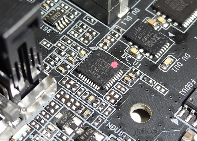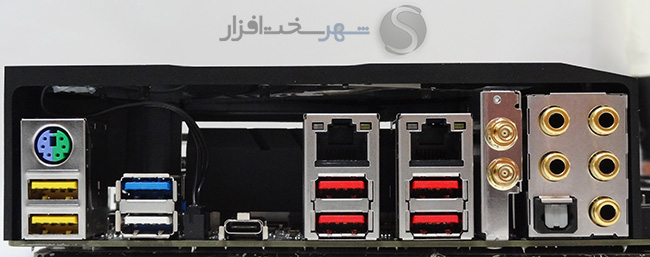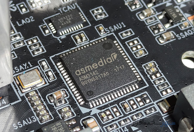 در این بین 4 پورت قرمز رنگ USB از نوع USB 3.1 Gen2 10Gb/s هستند و از چیپست USB 3.1 HUB ساخت کمپانی Realtek منشعب شدهاند. همچنین تنها پورتUSB 3.1 Gen2 Type-C این مجموعه نیز از چیپست جدید و فوقالعاده پرسرعت و مدرن ASMEDIA 3142 منشعب شده است.