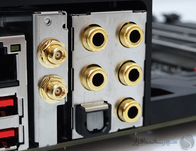 خروجیهای صدا نیز در این مادربرد در بخش آنالوگ از نوع 7.1-channel و مجهز به جکهای 3.5mm با روکش طلا میباشد که در عمل باعث افزایش کیفیت اتصال، کاهش نویز و خوردگی و اکسیداسیون در اثر رطوبت و قطع و وصل مکرر میشود. در بخش Digital نیز پورت Optical S/PDIF out جوابگوی نیازهای حرفهایتر خواهد بود.