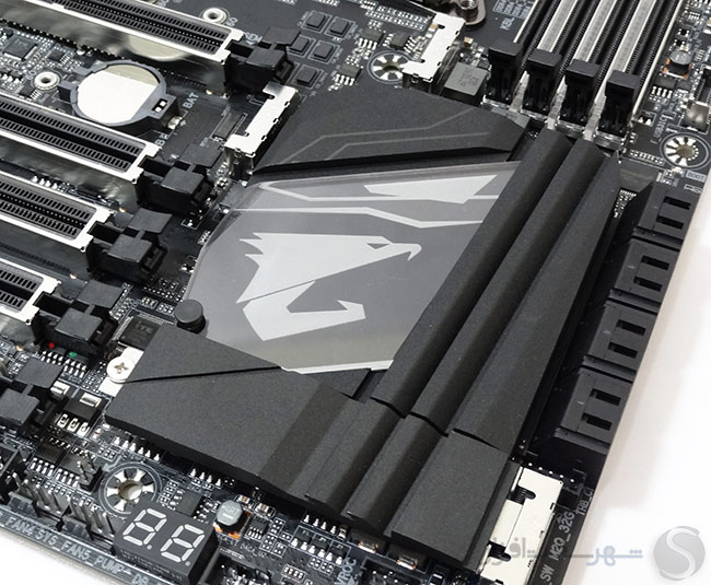 اما کانکتور سوم نیز زیر هیتسینک چیپست Intel PCH X299 تعبیه شده و به یک هیتسینک آلومینیومی مجزا جهت دفع حرارت تجهیزات ذخیره سازی NVMe مجهز شده است. همچنین این اسلات از تجهیزات سازگار با رابط PCIe X4/X2, SATA و استاندارد طول 2242/2260/2280 پشتیبانی میکند.
