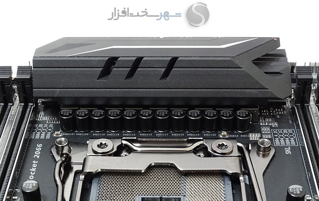 البته یکی از این دو هیتسینک مستقیماً بر روی ماسفت ها نصب میشود و به دلیل محدودیت فضا در مادربردهای سری HEDT اینتل هیتسینک دوم که بهواسطه یک هیت پایپ مسی با قطر 6mm به هیتسینک اصلی متصل شده و دقیقاً در پشت پورتهای پنل I/O تعبیه شده است کمک حال هیتسینک اول میباشد.