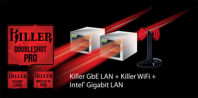 - دارای 2 درگاه شبکه سیمی و درگاه شبکه بیسیم 802.11 ac 867Mb/s مبتنی بر سامانه Killer DoubleShot™ Pro