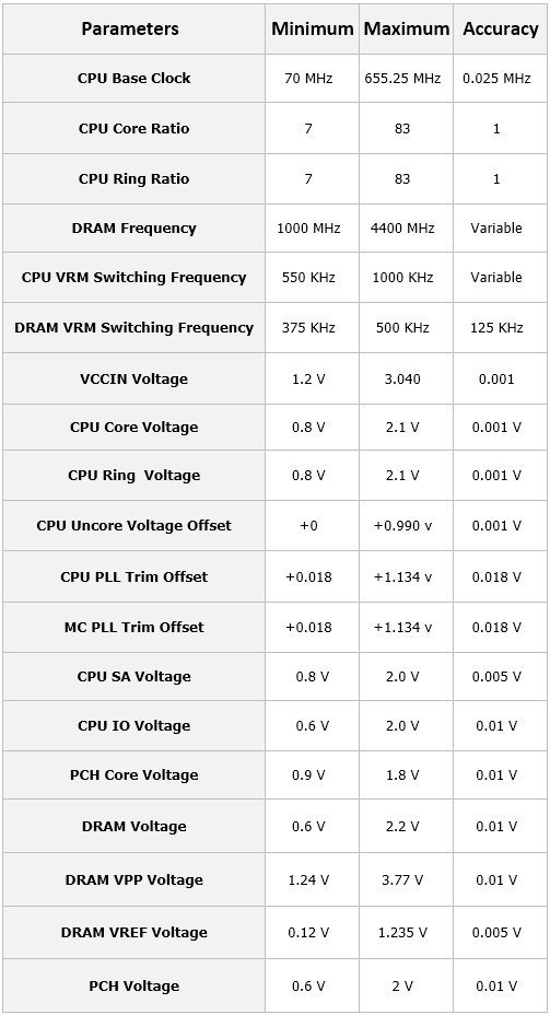 همچنین اینتل امکان تغییر نسبت آفست AVX-512 را اضافه کرده که یک قابلیت سودمند برای دست یابی به اورکلاک های بالاتر تحت بنچ مارکهای غیر AVX است. این کمپانی نه تنها قابلیت تقلیل و ثابت نگه داشتن (Trim) ولتاژ کنترلر حافظه را اضافه کرده، بلکه شاهد بازگشت قابلیت اورکلاکینگ PEG (PCIe) و DMI هستیم. قابلیت اورکلاک کردن DMI بهطور ویژه در عبور از محدودیتهای پهنای باند سودمند است. همچنین اینتل طرحهای گارانتی قابل انتخاب برای پردازندههای خود را یک مرحله دیگر گسترش داده و حالا میتوان طرح گارانتی با پوشش خرابیهای ناشی از اورکلاکینگ را نیز انتخاب کرد.