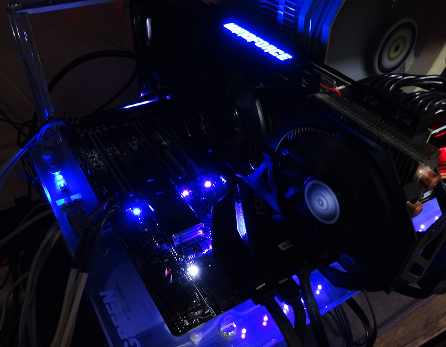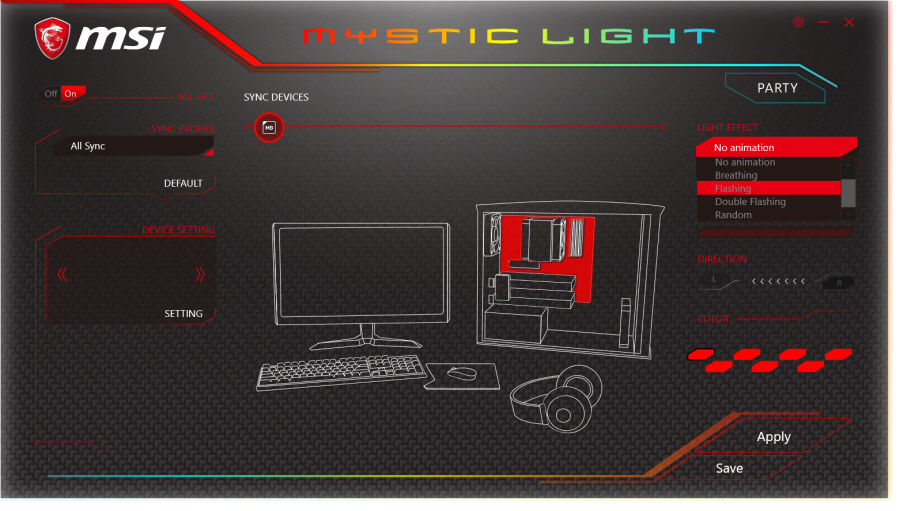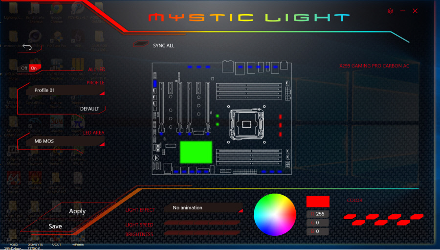 همانند اغلب مادربردهای رده بالا و گیمینگ، کمپانی MSI این مدل را نیز به سامانه نورپردازی با RGB LED تحت عنوان MYSTIC LIGHT مجهز کرده است. این LED ها همانطور که در تصویر بالا ملاحظه میکنید بر روی کاور پلاستیکی روی پنل پشتی مادربرد و مدار سیستم صوتی، در پشت هیت سینکهای مدار رگولاتور و چیپست PCH و زیر پورتهای SATA و کانکتور 24Pin ATX در پشت PCB تعبیه شدهاند.