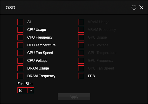 در بخش OSD قابلیت مشاهده پارامترهای ولتاژی، حرارتی و فرکانسی پردازنده و حافظههای RAM به همراه نرخ FPS در حین اجرای گیم به صورت On Screen فراهم شده است.