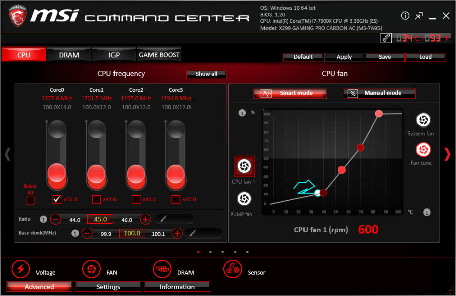 همانطور که در تصویر بالا ملاحظه میکنید امکانات این نرم افزار در 4 تب مختلف طبقه بندی شدهاند. در تب اول (CPU) قابلیت تنظیم مهمترین پارامترهای پردازنده، نظیر ضریب فرکانس هستهها، Base Clock و حتی سرعت چرخش فن فراهم شده است.