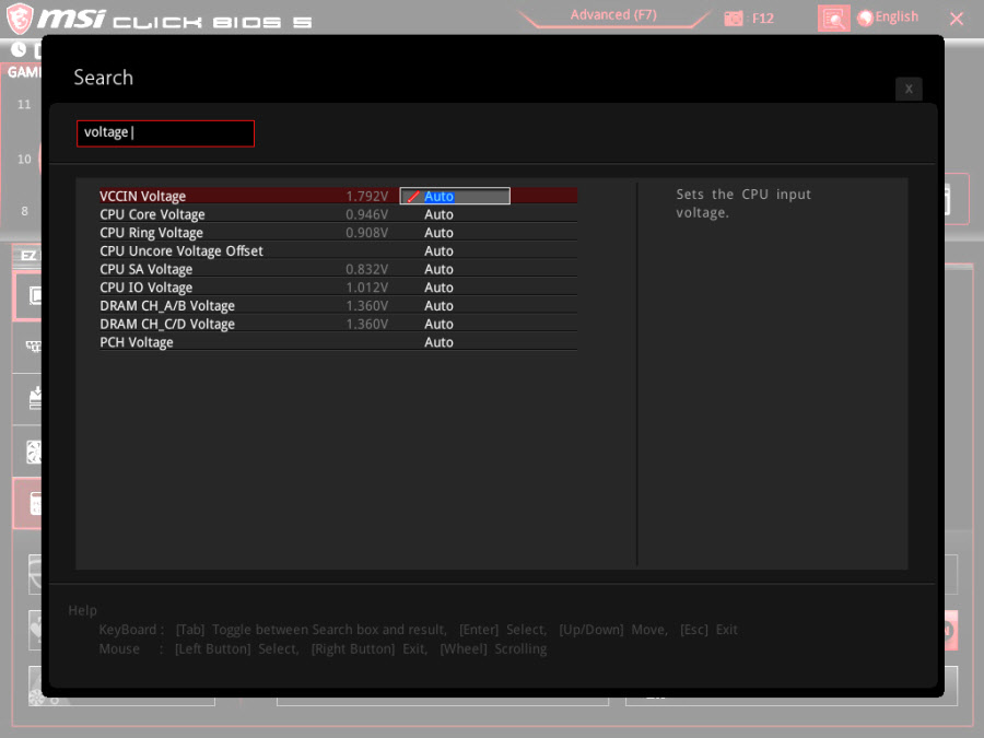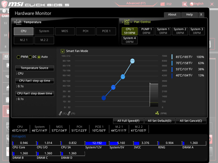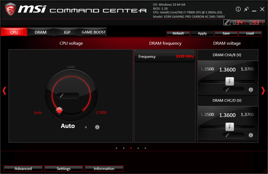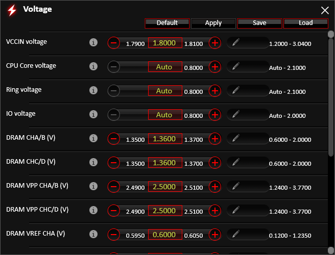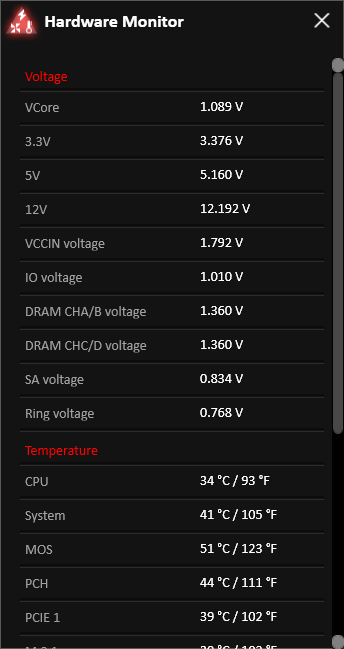 با انتخاب گزینه Advanced در پنجره این بخش میتوانید به جزئیات پارامترهای ولتاژی، سرعت چرخش فنها و تنظیمات تایمینگ ماژولهای حافظه دسترسی داشته باشید.