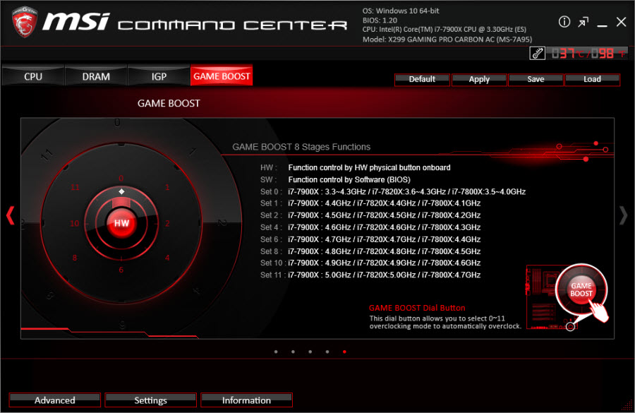 در بخش Game Boost این امکان فراهم شده تا به صورت نرم افزاری قابلیت GAME BOOST و 11 پروفایل از پیش تعیین شده اورکلاک پردازنده را فعال کنید.