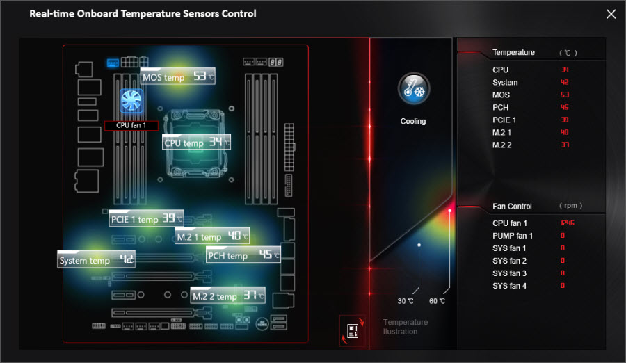 Real-time Onboard Temperature Sensor Control در این نرم افزار بهواسطه 7 حسگر حرارتی تعبیه شده در دو بخش مختلف مادربرد حرارت حیاتیترین بخشهای سیستم را بهصورت برخط مانیتور و تنها با یک کلیک سیستم خنک کننده سیستم را جهت تهویه بهتر تنظیم میکند.