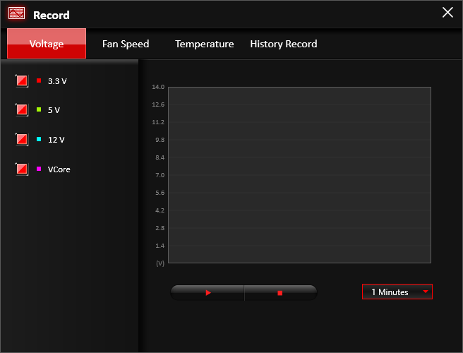 بخش Record نیز تمامی فعل و انفعالات رخ داده در تمامی پارامترهای ولتاژی، حرارتی و سرعت چرخش فنها را در یک فایل مجزا ذخیره کرده تا کاربر یا کاربران سیستم در مواقع لازم بهراحتی توانایی بازبینی این اطلاعات را داشته باشند.