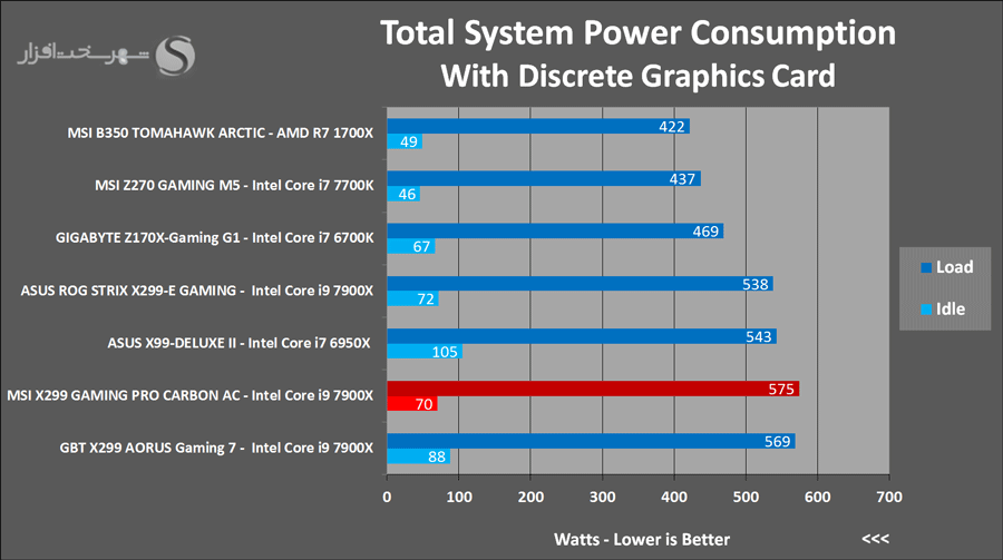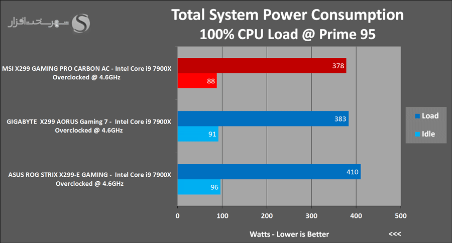 در این بخش توان مصرفی کل سیستم را (توان مصرفی از برق شهر توسط پاور سیستم) توسط دستگاه وات متر دیجیتال در دو وضعیت با کارت گرافیک مجزا و بدون کارت گرافیک مجزا در دو حالت Idle (15 دقیقه بدون هیچ گونه فعل و انفعال) و در حالت Load کامل CPU و GPU (بهواسطه 15 دقیقه اجرای هم زمان تست CPU: OCCT و تست Burn-in نرم افزار FurMark) اندازه گیری کردیم. نتیجه به دست آمده به شرح زیر است:نتیجه به دست آمده در این بخش را میتوان از دو دید مختلف تحلیل کرد. همانطور که ملاحظه میکنید توان مصرفی حالت بیباری (Idle) این مادربرد در مقایسه مدلهای مشابه از دو کمپانی رقیب کمتر است و این بدین معناست که MSI در مدیریت مصرف انرژی بخشهای مختلف مادربرد در حالت بیباری موفق بوده است؛ اما در وضعیت Load ورق بر میگردد و شاهد عملکرد خوبی از این مادربرد نیستیم. با توجه به کامپوننت های بسیار باکیفیت و مدرنی که در مدار رگولاتور ولتاژ این مادربرد استفاده شده بود بعید میدانیم دلیل ثبت این نتیجه عملکرد ضعیف آن بخش باشد. حدس میزنیم طبق معمول و مشابه عملکرد کمپانیهای رقیب کم و بیش دور زدن Power State های استاندارد اینتل در تنظیم فرکانس Turbo Boost و تا حدودی Vcore بالای پردازنده دلیل ثبت این نتیجه باشند.
