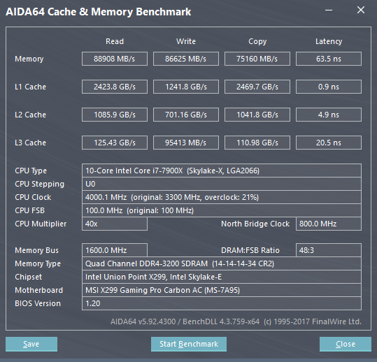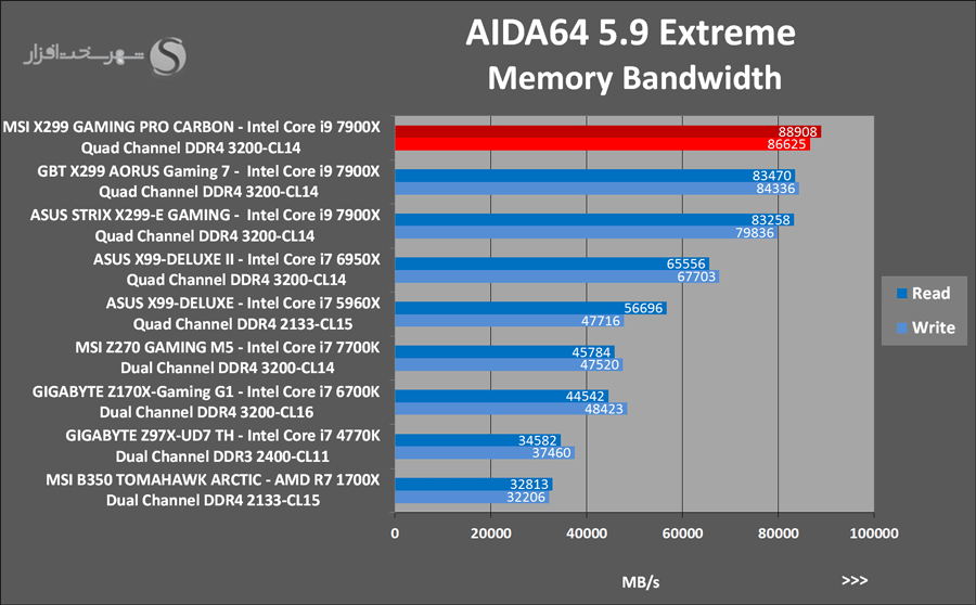 تست پهنای باند حافظه از جمله تستهایی هست که نتایج آن کاملاً به وضعیت سیستمعامل، فرکانس و معماری ساخت پردازنده و کنترلر حافظه، Bios هوشمند در انتخاب بهترین و عین حال پایدارترین تایمینگ های اصلی و Advanced و پیکربندی و فرکانس ماژولهای حافظه و State های مختلف مدیریت مصرف انرژی وابسته است.چند سالی است که پتانسیل بسیار بالای مادربردهای رده بالا و پرچم دار MSI در پیکربندی و اورکلاک ماژولهای حافظه RAM یکی از مهمترین نقاط قوت آنها محسوب میشود. این مادربرد نیز از این قاعده مستثنا نیست و نتیجه ثبت شده در این تست بهروشنی این امر را تصدیق میکند.
