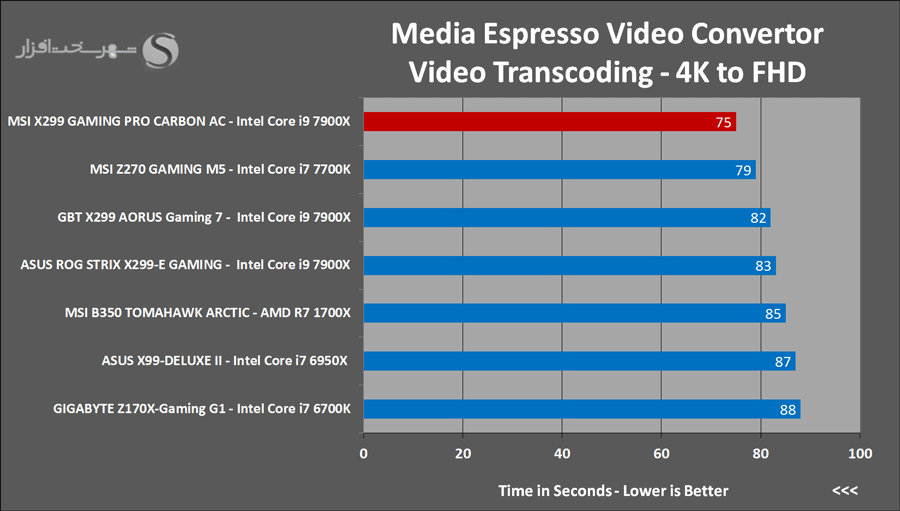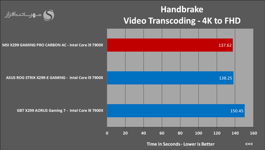 همچنین در تست نرم افزار HandBrake از توان CPU برای تبدیل یک فایل ویدئویی باکیفیت 2160p با فرمت MP4 و کمک AVC1 با حجم 481MB به ویدئویی با کیفیت 1080p با فرمت MKV و کدک H265 استفاده شده است.