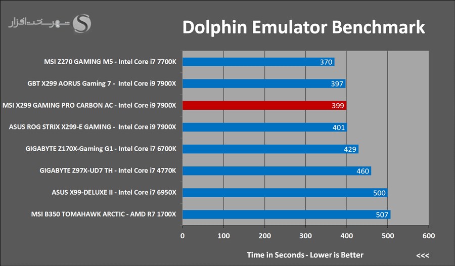 Dolphin Emulator یک شبیه ساز بسیار قدرتمند برای اجرای بازیهای کنسولهای GameCube و Wii در PC آن هم با رزولوشن 1080p میباشد. کارایی بسیار بالا به همراه پشتیبانی از بازیهای آنلاین و تحت شبکه از ویژگیهای ممتاز این شبیه ساز محسوب میشود.عملکرد Benchmark این شبیه ساز به این صورت است که در این بخش الگوریتمی استاندارد و ثابت که شامل رندر یک صحنه پیچیده 3 بعدی با استفاده از تکنیک ray tracing میشود اجرا و زمان سپری شده برای رندر کامل این صحنه ملاک کارایی پردازنده محسوب میشود. البته مد نظر داشته باشید که این نرم افزار کاملاً Multithread نیست و فرکانس و معماری هسته پردازنده مهمترین نقش را در اجرای سریعتر این شبیه ساز بازی میکنند.