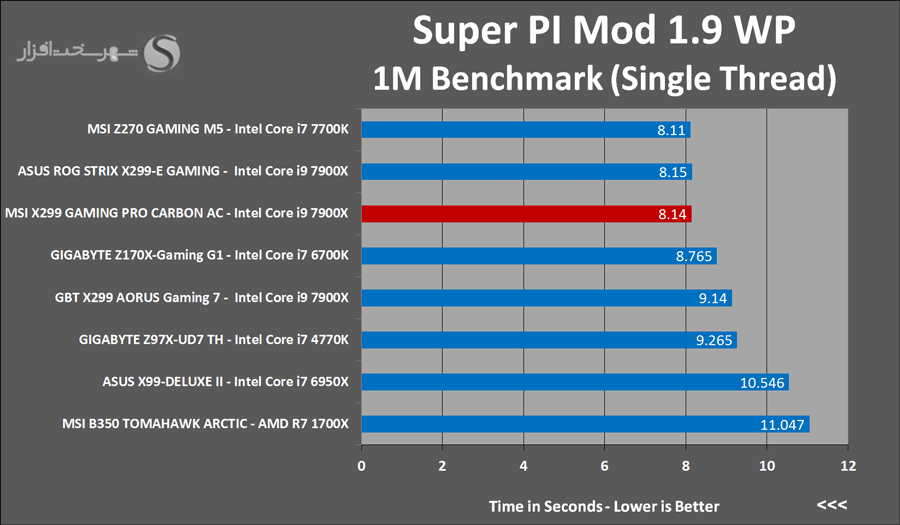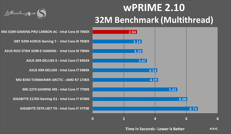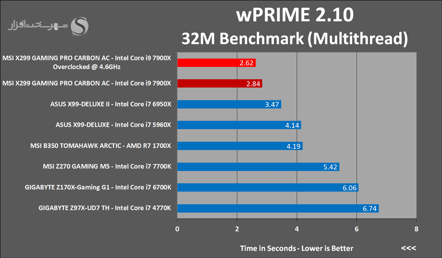 wPrime از جمله نرمافزارهایی میباشد که با محاسبه الگوريتمي تکرار شونده (تخمين تابع به روش نيوتن) بهصورت کاملاً Multithread، يکي از بهترين نرمافزارهای موجود براي تست کارایی پردازنده و مادربرد محسوب میشود. Super PI نیز یک نرم افزار Single Thread برای محاسبه عدد π با استفاده از الگوریتم Gauss–Legendre تا 232 رقم اعشار است. فرکانس و معماری هسته پردازنده تعیین کننده ترین عوامل در افزایش سرعت پردازش این نرم افزار هستند.تست کارایی تجهیزات ذخیرهسازی SATA با نرم افزار CrystalDiskMark 5.0.2