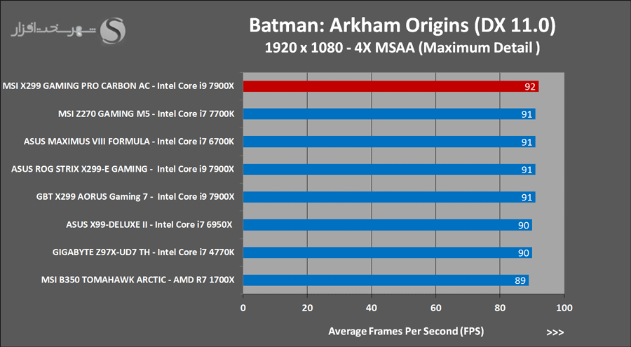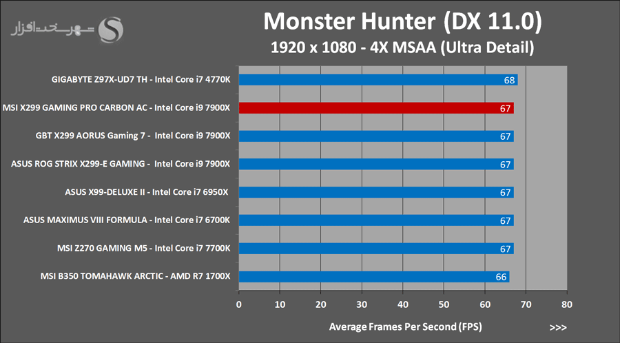 Monster Hunter که یک بازی تحت شبکه پرطرفدار است محصول کمپانی Tencent Games بوده و موتور گرافیکی بسیار قدرتمند Crytek به همراه قابلیتهای واقعگرایانه جدید GameWorks کمپانی Nvidia مثل NVIDIA PhysX Clothing, NVIDIA Hairworks و NVIDIA HBAO+ را با خود همراه دارد. ویژگیهای نامبرده بهعلاوه تکنولوژیهای مدرن Real Time Rendering, Physical Based Shading, Realistic Vegetation Rendering همگی باعث شدهاند تا Benchmark این بازی در حال حاضر یکی از مدرنترین و در عین حال زیباترین دموهای گرافیکی مبتنی بر DirectX 11 محسوب شود.بهروشنی مشخص است که این مادربرد علاوه بر تستهای خام پردازنده در کاربردهای گیمینگ نیز خارقالعاده عمل میکند. در واقع یکی دیگر از نتایج دور زدن Power State های اینتل به غیر از مواردی که در بخش تستهای مدیریت مصرف انرژی و حرارتی مشاهده کردید، کارایی فراتر از حد و اندازههای معمول است.