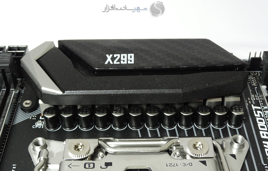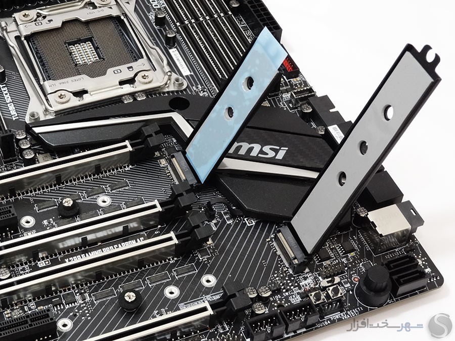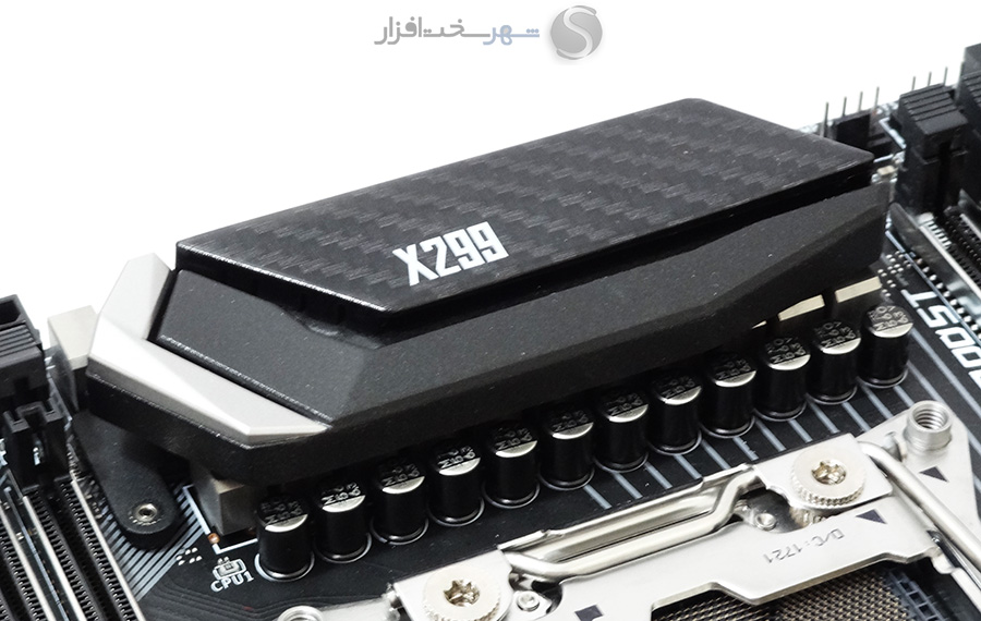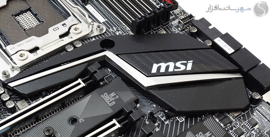 بخش اول که هیت سینک کوچکی نیز به نظر میرسد وظیفه دفع حرارت از ماسفت های مدار رگولاتور ولتاژ پردازنده را بر عهده دارند.بخش دوم نیز که طراحی کشیده، خاص و ناموزون دارد و لوگو MSI نیز بر روی آن نقش بسته است وظیفه دفع حرارت از چیپست Intel PCH X299 را بر عهده دارد. ابعاد و اندازه این هیت سینک برای دفع حرارت این چیپست کم مصرف 6W کافی به نظر میرسد. البته امتداد بخش بالایی این هیت سینک تنها جنبه نمایشی دارد و برای تکمیل نورپردازی این مادربرد در نظر گرفته شده است.