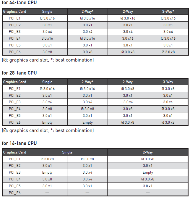 بر بخش اسلات های توسعه شاهد 4 اسلات PCIe 3.0 X16 و 2 اسلات PCIe 3.0 X1 هستیم که در این بین تمامی اسلات های X16 از Lane های منشعب شده از کنترلر PCIe تعبیه شده در پردازنده و اسلات های X1 از چیپست Intel X299 تغذیه میشوند. این مادربرد از پیکربندیهای سهگانه (3-Way) Multi GPU Nvidia SLI و AMD CrossFireX پشتیبانی میکند اما کارایی عملیاتی هر یک از 3 اسلات نام برده به نوع پردازنده نصب شده بر روی مادربرد وابسته است. در جداول زیر سرعت عملیاتی هر یکی از 3 اسلات PCIe X16 نام برده را در صورت نصب پردازندههای دارای 16/28/44 Lane PCIe را مشاهده میکنید.