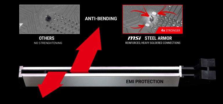 علاوه بر این پشتیبانی این مادربرد از استاندارد نظامی Military Class 6 ایمنی و صحت عملکرد آن را در بدترین شرایط آب و هوایی نظیر رطوبت و حرارت بالا تضمین میکند. این در حالی است که این مادربرد به پروتکشن هایی نظیر حافظت در برابر امواج الکترومغناطیسی و اتصال کوتاه نیز مجهز شده است.