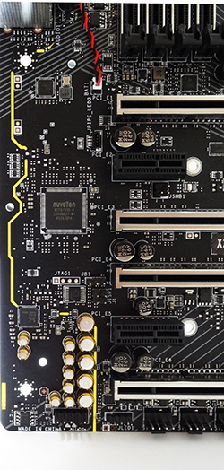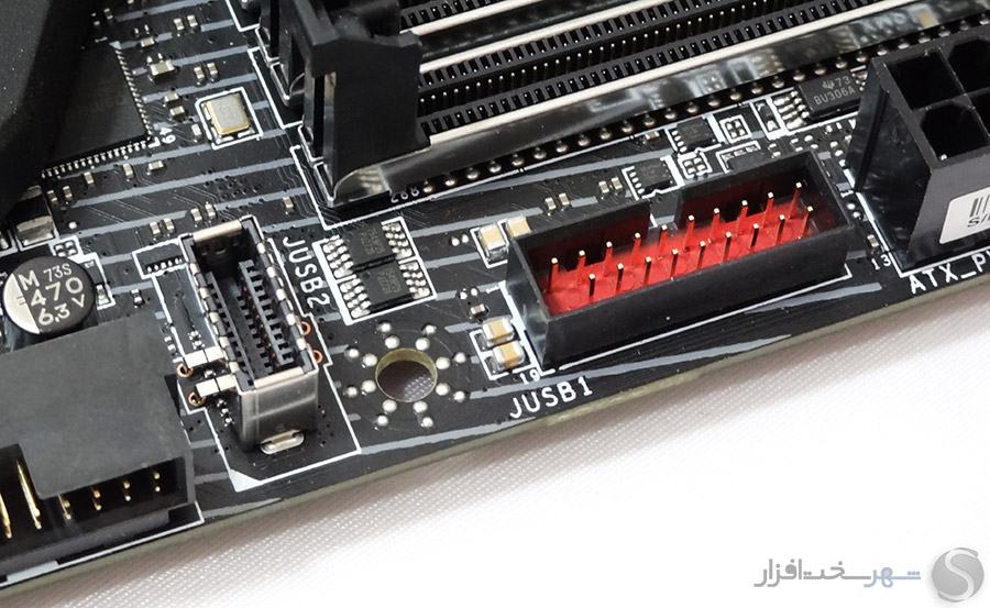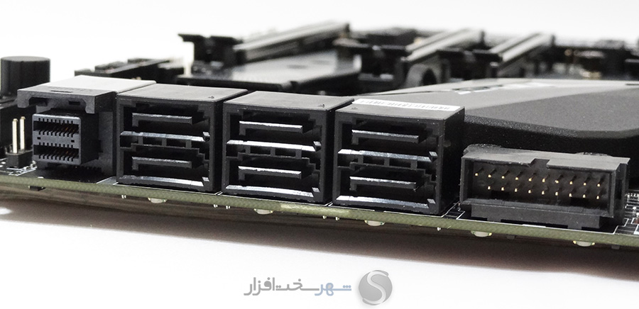 همچنین در سمت راست پورتهای SATA یکی از دو کانکتور 19 پین USB 3.0 منشعب شده از چیپست PCH Intel X299 تعبیه شده است که روی هم رفته 2 پورت USB 3.1 Gen1 جهت اتصال به پنل جلویی کیس و یا براکت های جانبی فراهم میکند.