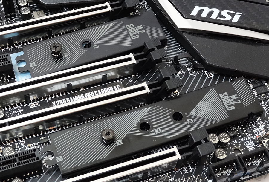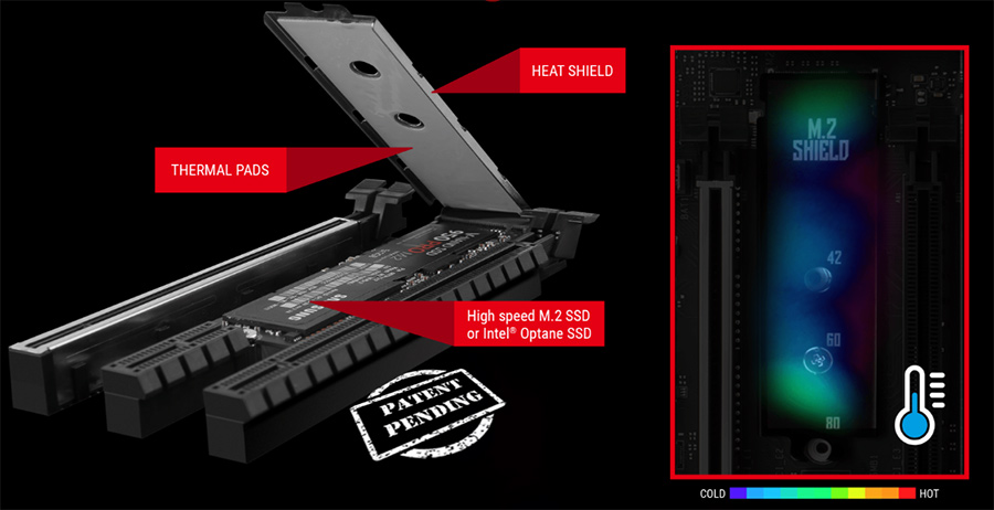 یکی از قابلیتهای کمنظیر این مادربرد تجهیز یکی از اسلات های M.2 به پوشش فلزی مجهز به پد حرارتی تحت عنوان M.2 SHIELD است. این پوشش که در عمل بهعنوان هیت سینک تجهیزات با گذرگاه M.2 عمل میکند با دفع سریعتر حرارت متصاعد شده از تراشههای حافظه فوقالعاده پرسرعت این نوع تجهیزات، باعث افزایش محسوس کارایی آنها در استفادههای طولانی مدت خواهد شد.