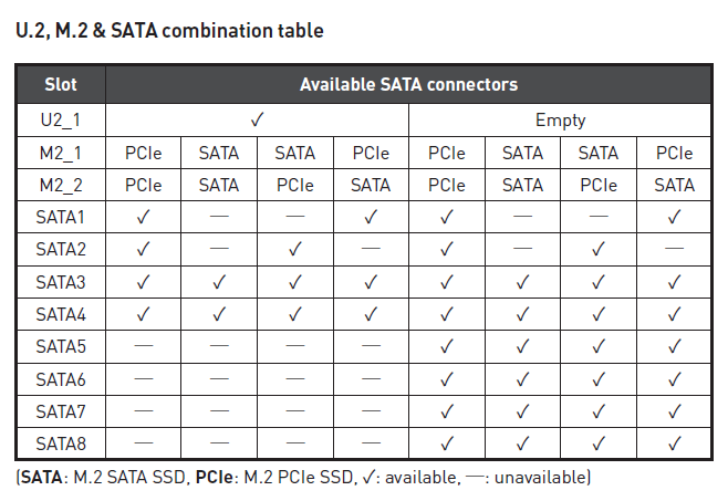 اما اگر بلاک دیاگرام این مادربرد را با دقت مشاهده کرده باشید حتماً متوجه شدهاید که پهنای باند تخصیص داده شده به درگاه U.2، اسلات های M.2 X4 و 8 پورت SATA این مادربرد در برخی موارد مشترک هستند. در جدول زیر محدودیتهای این بخش به صورت کامل شرح داده شده است.