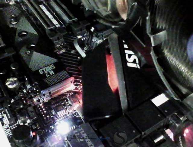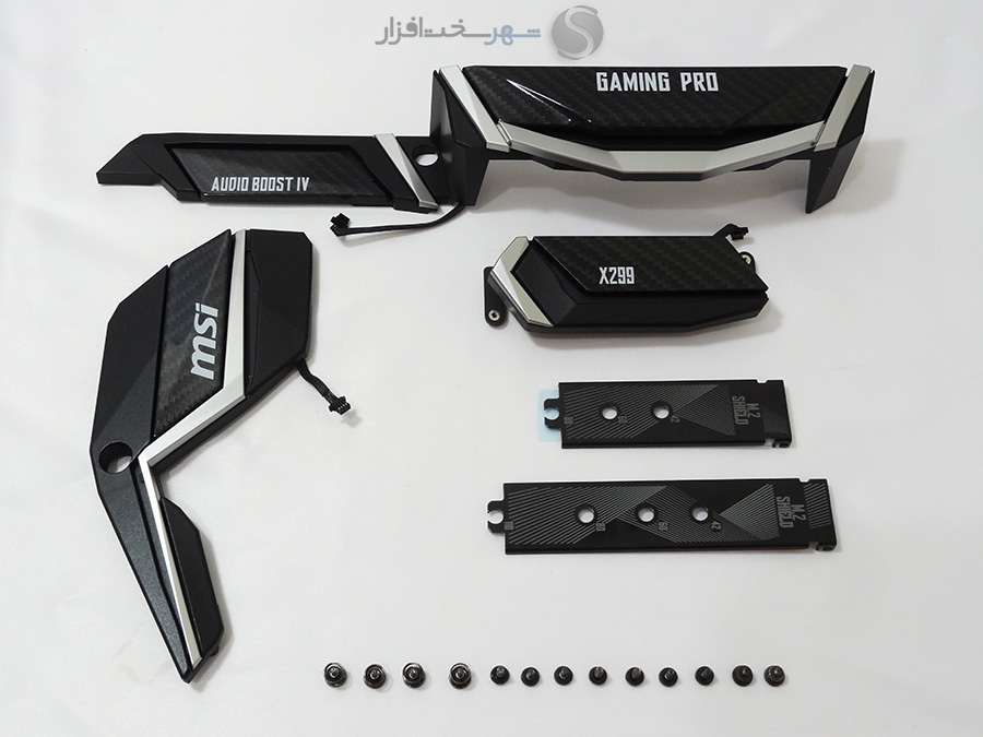در تصاویر بالا هیت سینکهای سیستم خنک کننده به همراه 13 پیچ برای نصب آنها بر روی PCB و در کنار آنها نیز پوششهای پلاستیکی تعبیه شده بر روی قطعات سیستم صوتی و پورتهای پنل پشتی مادربرد را ملاحظه میکنید.MSI برای انتقال حرارت بهتر در همه هیت سینکها به غیر هیت سینک PCH از پد حرارتی نسبتاً مرغوب استفاده کرده است. پدهای حرارتی در مقایسه با خمیرهای حرارتی عمر بیشتری دارند و انعطاف پذیر ترند ولی در عمل ظرفیت انتقال حرارت آنها تا حدودی کمتر است.