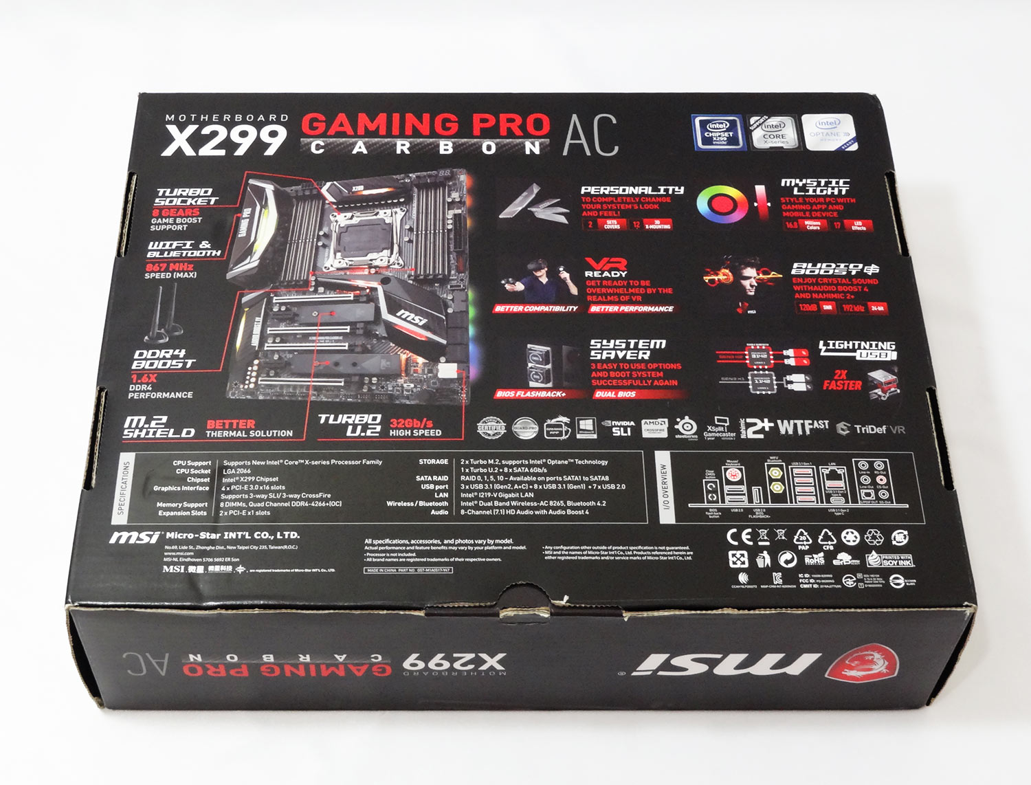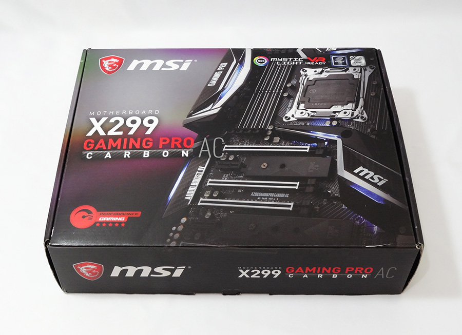 چیدمان روی جعبه مادربردهای جدید گیمینگ کمپانی MSI چند وقتی میشود که از یک طرح هماهنگ پیروی میکند. تصویری بزرگ از مادربرد در گوشه سمت راست و لوگو و برند تجاری گیمینگ MSI به همراه مدل مادربرد در سمت چپ. بر خلاف مادربردهای با پسوند GAMING Mx که رنگ لعابی با رنگ زمینه قرمز دارند، جعبه مادربردهای سری GAMING PRO CARBON مخلوطی از رنگهای بنفش تیره و مشکی است.