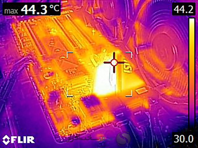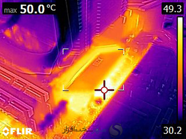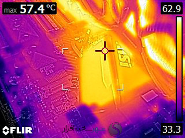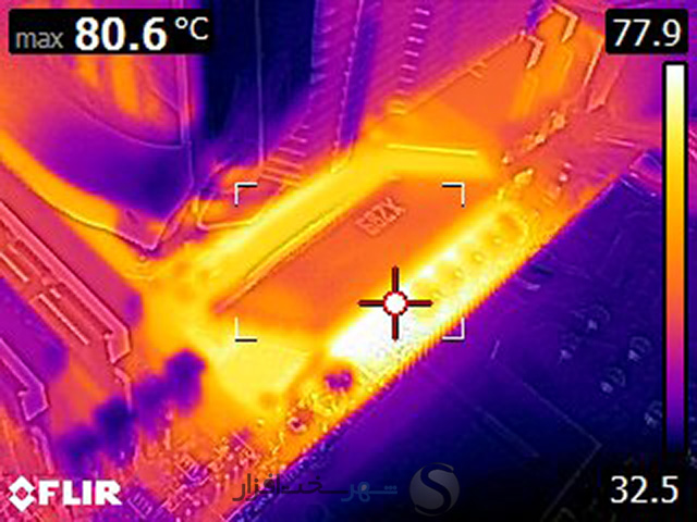 در این تست نیز حرارت داغترین نقطه از هیت سینک و یا قطعات مربوط به مدار رگولاتور ولتاژ پردازنده (VRM) و چیپست PCH را در دو وضعیت شرح داده شده در تست مدیریت مصرف انرژی با استفاده از دوربین حرارتی FLIR E5 اندازه گیری کردیم.تصاویر ثبت شده در حالت بی باری (Idle)