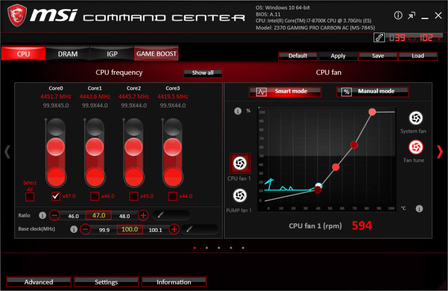 در بخش Game Boost این امکان فراهم شده تا به صورت نرم افزاری قابلیت GAME BOOST را فعال کنید. این قابلیت به شما کمک میکند تا در سریعترین زمان ممکن و به شیوهای راحت، سیستم خود را بدون هرگونه پیچیدگی اورکلاک کنید تا کارایی دریافتشده از پردازنده و رم را افزایش دهید. بدین ترتیب در بازیها نیز نرخ فریم بالاتری کسب خواهد شد. بنابراین گیمرها بدون هیچ دردسری میتوانند سیستم خود را با یک کلیک اورکلاک کنند.