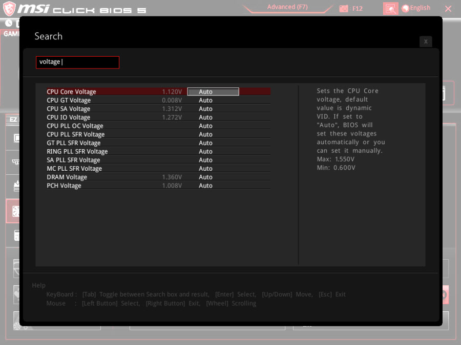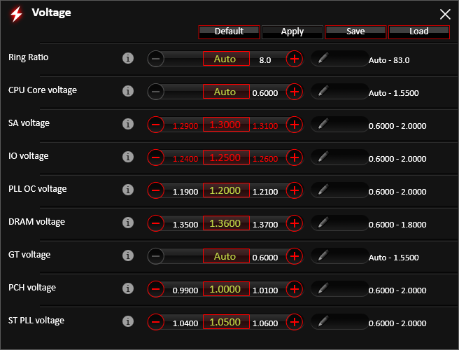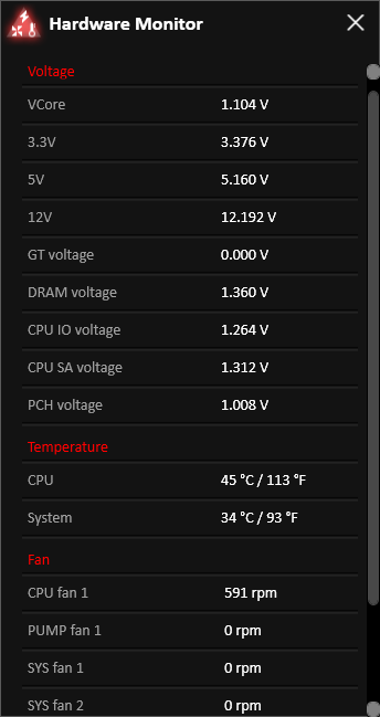 با انتخاب گزینه Advanced در پنجره این بخش میتوانید به جزئیات پارامترهای ولتاژی، سرعت چرخش فنها و تنظیمات تایمینگ ماژولهای حافظه دسترسی داشته باشید.