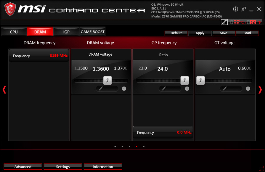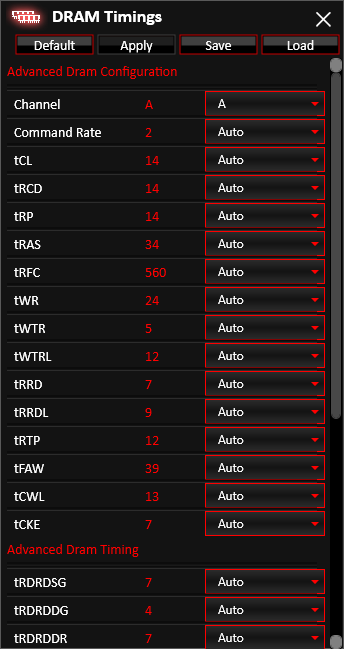 در تب DRAM امکان تغییر ولتاژ و ضریب فرکانس ماژولهای حافظه فراهم شده است. همچنین بر تمامی تایمینگ های اصلی و پیشرفته ماژولهای حافظه نیز کنترل کامل خواهید داشت.