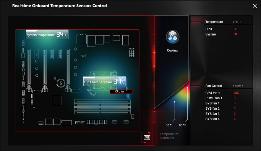 Real-time Onboard Temperature Sensor Control در این نرم افزار بهواسطه حسگرهای حرارتی تعبیه شده در دو بخش مختلف مادربرد حرارت حیاتیترین بخشهای سیستم را بهصورت برخط مانیتور و تنها با یک کلیک سیستم خنک کننده سیستم را جهت تهویه بهتر تنظیم میکند.
