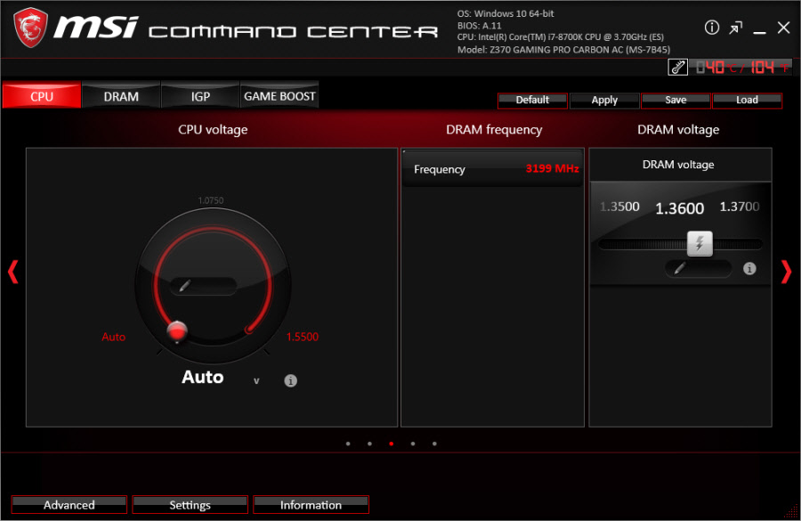 نسل جدید نرم افزار Command Center که در مادربردهای نسلهای قبل کمپانی MSI معرفی شد با کمی تغییرات در محیط گرافیکی، افزایش پایداری و اضافه شدن امکانات جدید همراه با نسل جدید مادربردهای این کمپانی نیز عرضه شده است. همانطور که در تصویر بالا ملاحظه میکنید امکانات این نرم افزار در 4 تب مختلف طبقه بندی شدهاند. در تب اول (CPU) قابلیت تنظیم مهمترین پارامترهای پردازنده، نظیر ضریب فرکانس هستهها، Base Clock و حتی سرعت چرخش فن فراهم شده است.