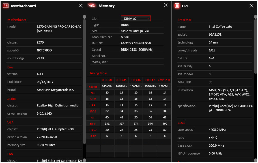 مشخصات کامل پردازنده، مادربرد و ماژولهای RAM سیستم نیز را میتوانید در بخش Info به صورت کامل مشاهده کنید.
