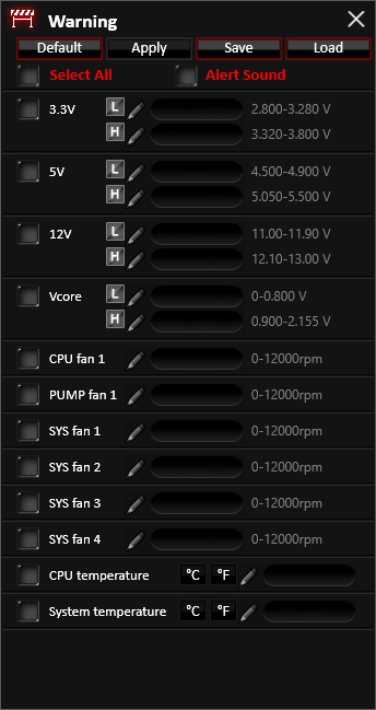 در بخش Warning تمهیداتی اندیشه شده تا در صورت خارج شدن پارامترهای مختلف ولتاژی، حرارتی و حتی سرعت چرخش فنها از محدوده تعیین شده، سیستم هشدار دهنده این نرم افزار کاربر را از مشکل به وجود آمده باخبر سازد. محدوده امن تمامی پارامترها بهصورت پیش فرض تنظیم شدهاند، اما این امکان فراهم شده تا کاربر نیز توانایی تغییر این محدودهها را داشته باشد.