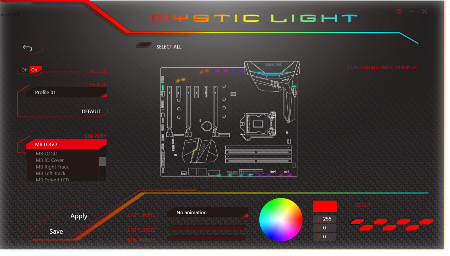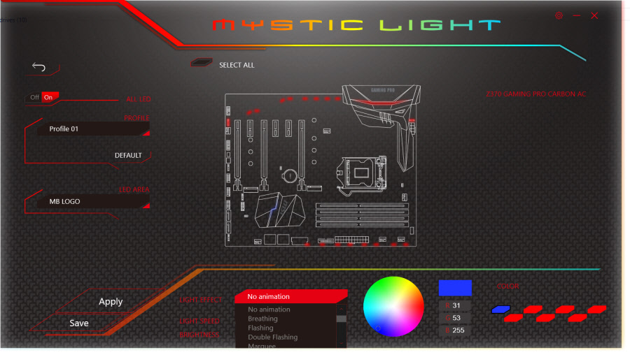 لازم به ذکر است این نرم افزار در برخی موارد دارای باگ و ناپایداری است. البته با توجه به نوپا بودن این نسخه امید میرود در نسخههای جدیدتر مشکلات موجود مرتفع گردند. در تصاویر زیر میتوانید نمونههایی از نورپردازی این مادربرد را مشاهده کنید: