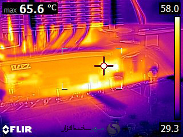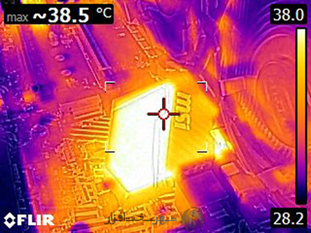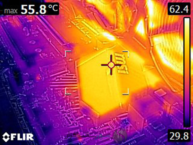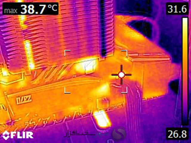 در این تست نیز حرارت داغترین نقطه از هیتسینک و یا قطعات مربوط به مدار رگولاتور ولتاژ پردازنده (VRM) و چیپست PCH را در دو وضعیت شرح داده شده در تست مدیریت مصرف انرژی با استفاده از دوربین حرارتی FLIR E5 اندازهگیری کردیم.تصاویر ثبت شده در حالت بی باری (Idle) :