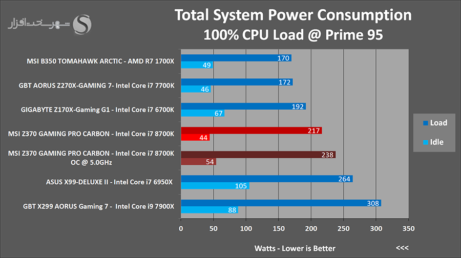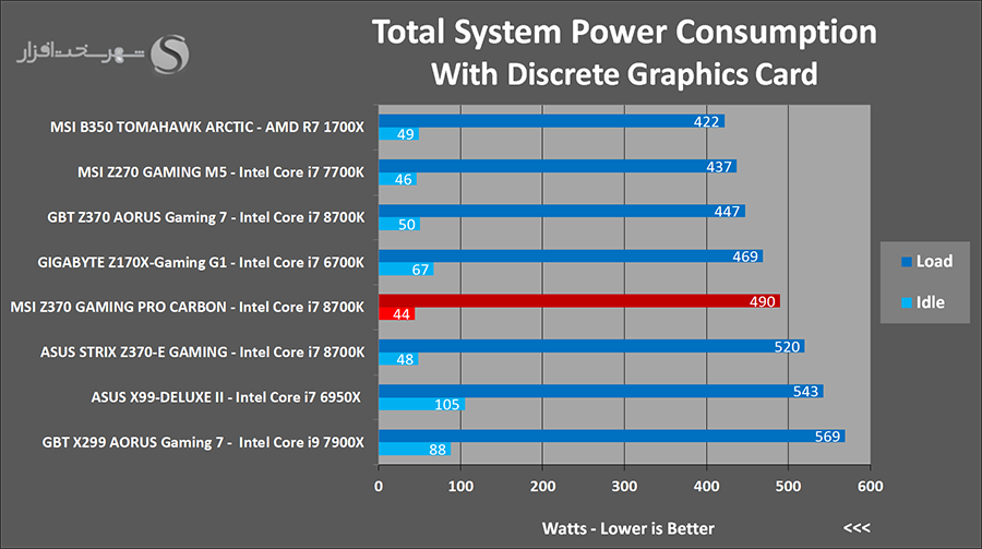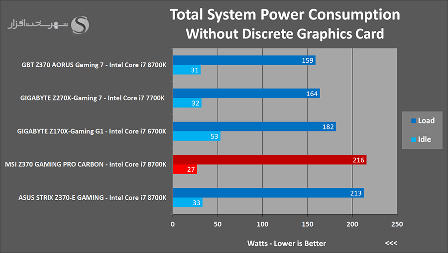 در این بخش توان مصرفی کل سیستم را (توان مصرفی از برق شهر توسط پاور سیستم) توسط دستگاه وات متر دیجیتال در دو وضعیت با کارت گرافیک مجزا و بدون کارت گرافیک مجزا در دو حالت Idle (15 دقیقه بدون هیچ گونه فعل و انفعال) و در حالت Load کامل CPU و GPU (بهواسطه 15 دقیقه اجرای هم زمان تست CPU: OCCT و تست Burn-in نرم افزار FurMark) اندازهگیری کردیم. نتیجه به دست آمده به شرح زیر است: