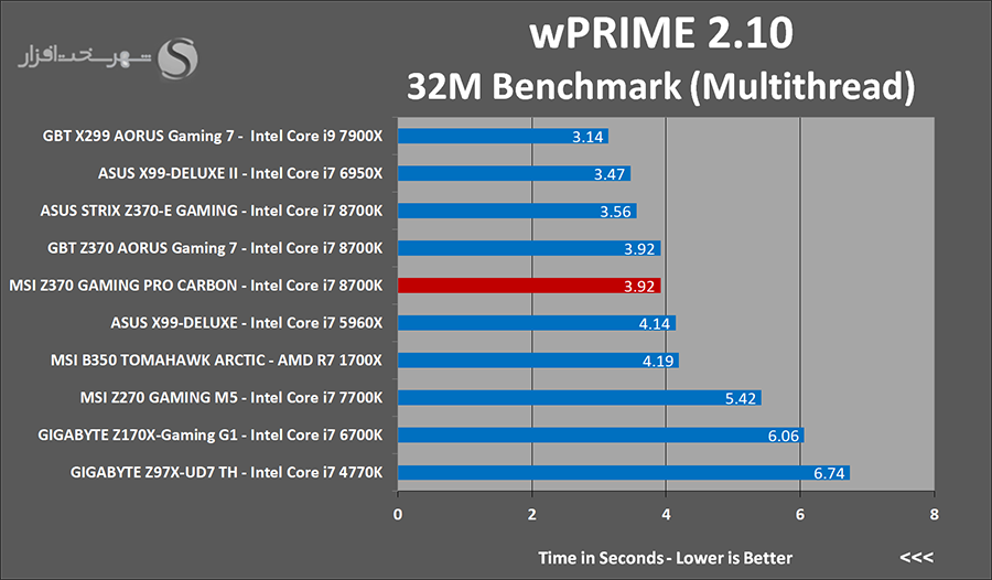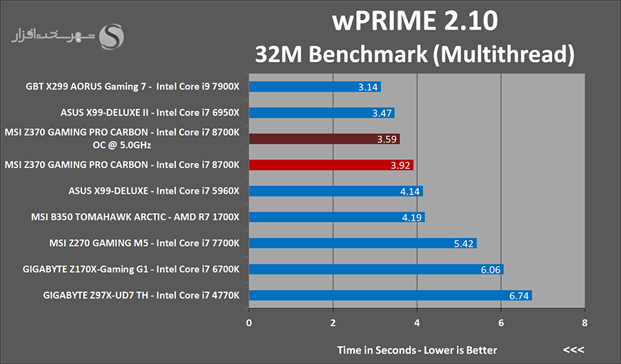 wPrime از جمله نرمافزارهایی میباشد که با محاسبه الگوريتمی تکرارشونده (تخمين تابع به روش نيوتن) بهصورت کاملاً Multithread، يکی از بهترين نرمافزارهای موجود براي تست کارایی پردازنده و مادربرد محسوب میشود. Super PI نیز یک نرم افزار Single Thread برای محاسبه عدد π با استفاده از الگوریتم Gauss–Legendre تا 232 رقم اعشار است. فرکانس و معماری هسته پردازنده تعیین کننده ترین عوامل در افزایش سرعت پردازش این نرم افزار هستند.