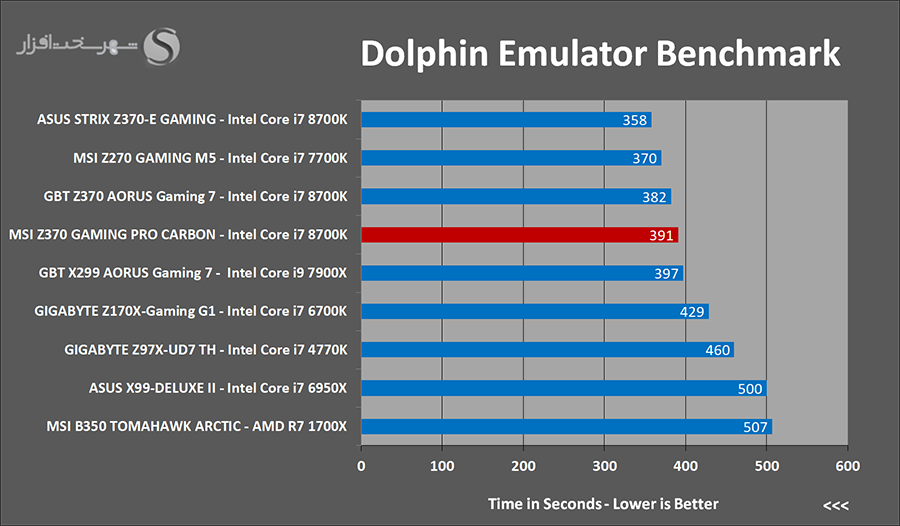 Dolphin Emulator یک شبیه ساز بسیار قدرتمند برای اجرای بازیهای کنسولهای GameCube و Wii در PC آن هم با رزولوشن 1080p میباشد. کارایی بسیار بالا به همراه پشتیبانی از بازیهای آنلاین و تحت شبکه از ویژگیهای ممتاز این شبیه ساز محسوب میشود.عملکرد Benchmark این شبیه ساز به این صورت است که در این بخش الگوریتمی استاندارد و ثابت که شامل رندر یک صحنه پیچیده 3 بعدی با استفاده از تکنیک ray tracing میشود اجرا و زمان سپری شده برای رندر کامل این صحنه ملاک کارایی پردازنده محسوب میشود. البته مد نظر داشته باشید که این نرم افزار کاملاً Multithread نیست و فرکانس و معماری هسته پردازنده مهمترین نقش را در اجرای سریعتر این شبیه ساز بازی میکنند.